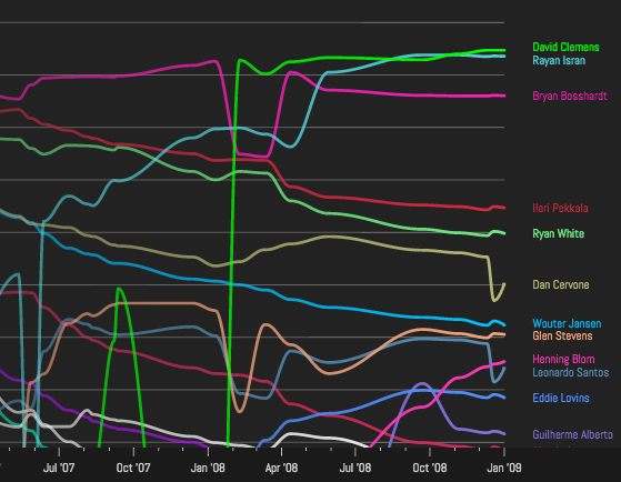 For the super-ancient period between 1997-08-25 and 2000-04-22 I'm just going to display the three players Sterling, Martin and Zwartjes (with no Y-Axis numbers) since the only data I have for that period is the relative ranking of these three players. If anyone knows anything else about this period, that will be useful for the visualisation.